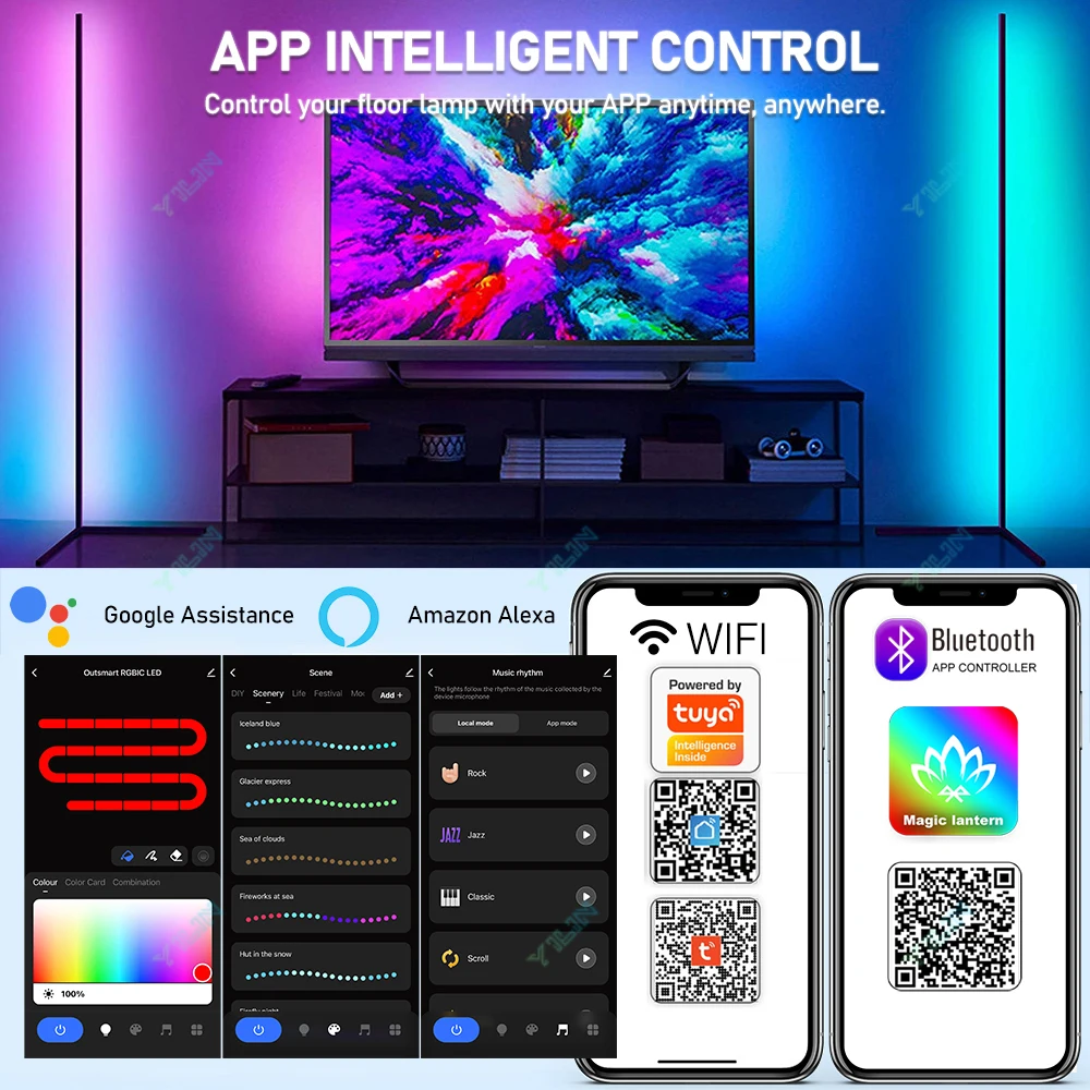 Enhance your space with the 180CM RGBIC Smart Floor Lamp, featuring customizable lighting effects controlled via Tuya Smart APP or remote. Its sleek Nordic design delivers vibrant mood lighting perfect for game rooms, bedrooms, or living areas, offering dynamic color transitions, adjustable brightness, and modern ambiance in one elegant stand lamp.