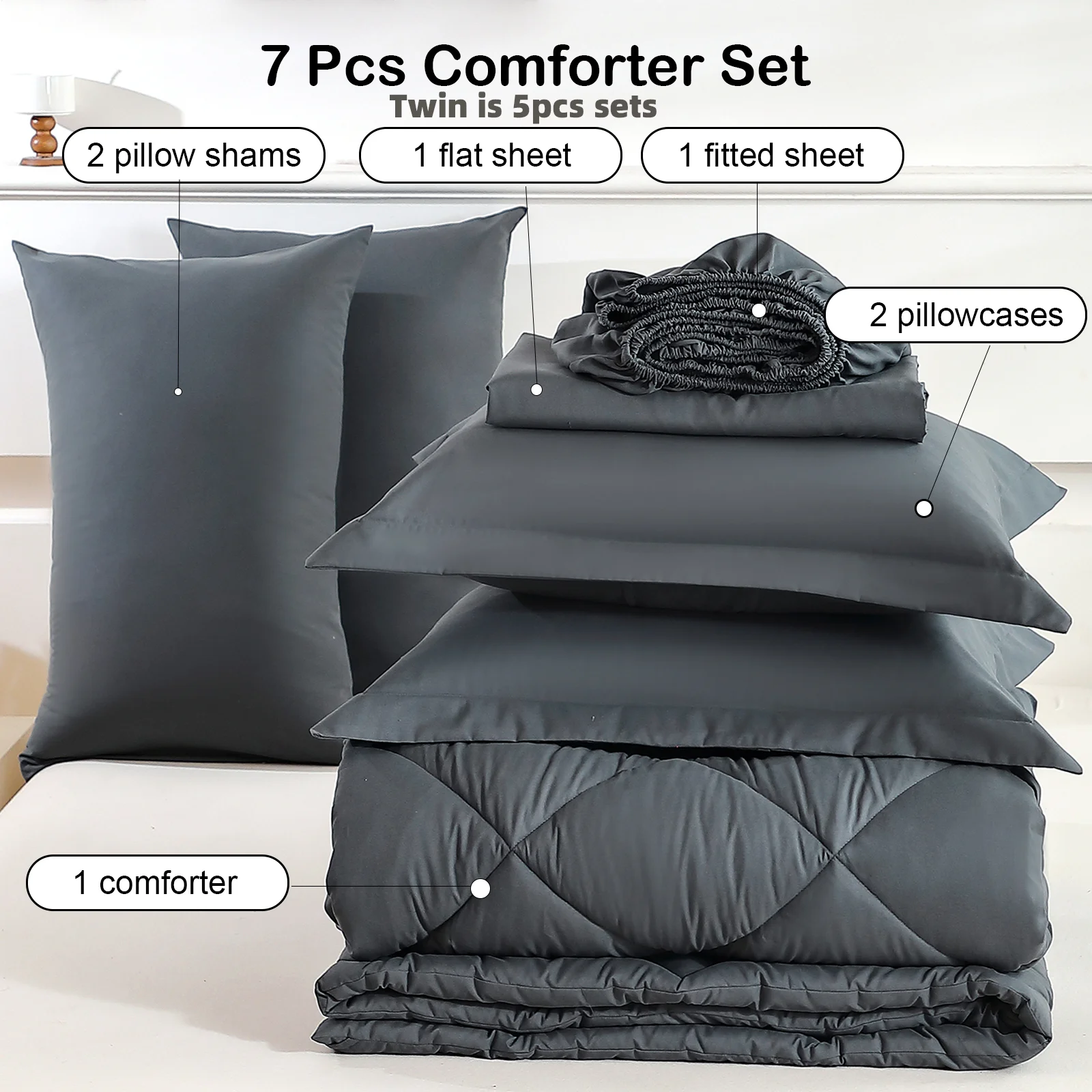 Complete your bedroom with this versatile 5- or 7-piece bedding set, available in Twin, Full, Queen, and King sizes. Includes comforter, flat sheet, fitted sheet, and pillowcases for a coordinated, stylish look. Soft, durable, and easy to maintain, it’s perfect for everyday comfort and home decor.