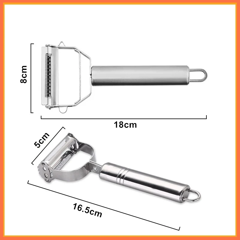 Durable stainless steel double-head peeler for fruits and vegetables. Multifunctional design easily handles peeling, slicing, and planing of melons, carrots, cucumbers, and more. Essential kitchen tool for quick, efficient prep.