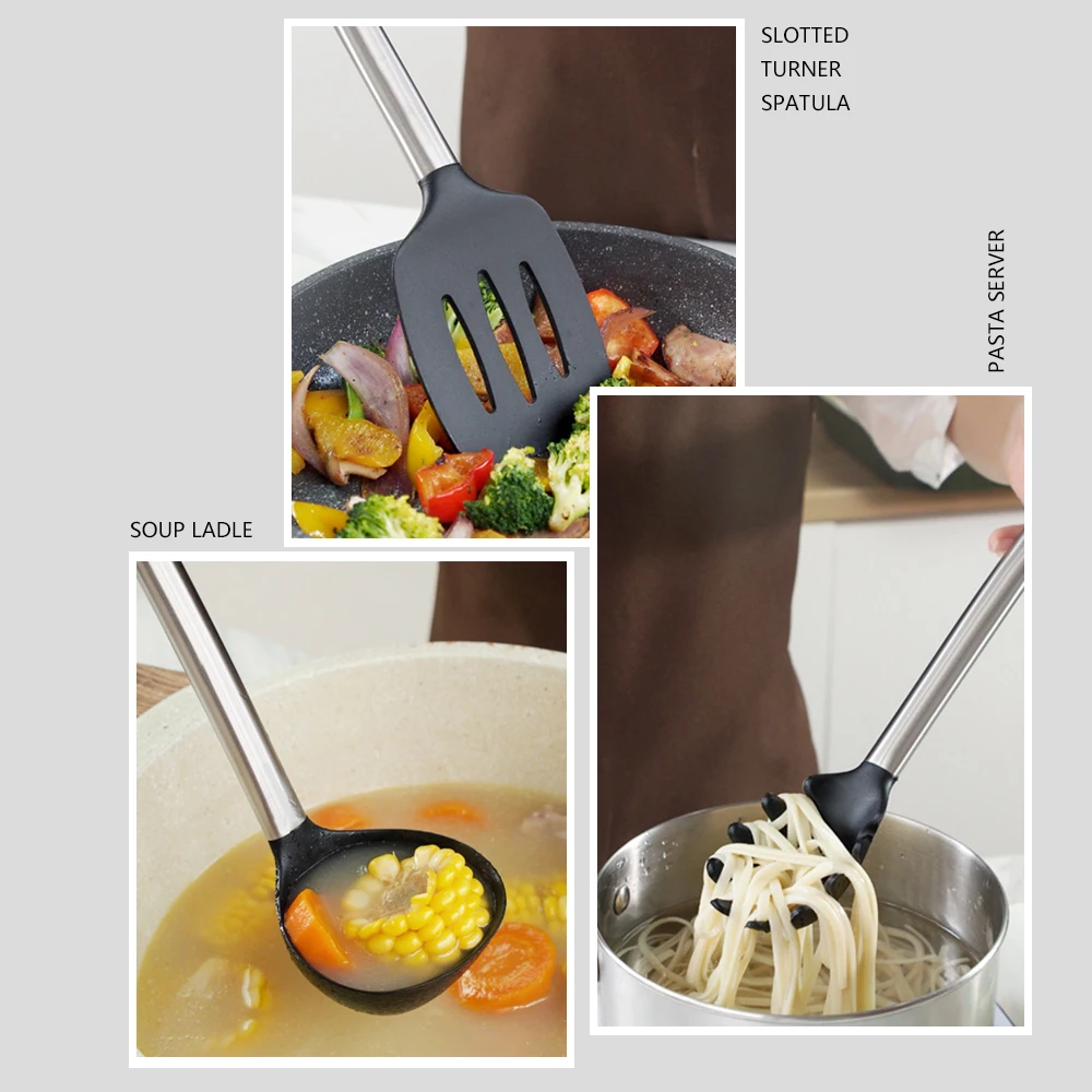 Durable silicone cooking utensil with a sturdy stainless steel handle, designed for safe and efficient food preparation. Heat-resistant and non-stick, perfect for stirring soups, draining pasta, and everyday cooking. A sleek, easy-to-clean kitchen accessory that combines style and functionality.