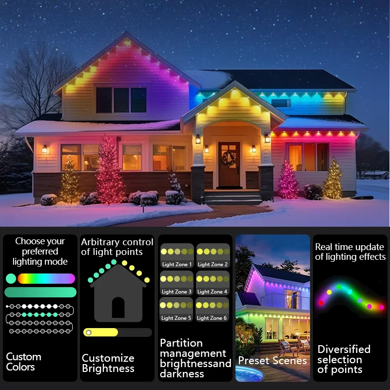 Enhance your outdoor space with these Smart RGBIC Outdoor String Lights. Available in 50ft, 100ft, and 150ft lengths, they feature 90 vibrant LEDs and 75 customizable scene modes. Perfect for patios, gardens, and rooftops, these waterproof, color-changing lights offer smart app control for brightness, color, and scheduling—creating the ideal ambiance year-round.