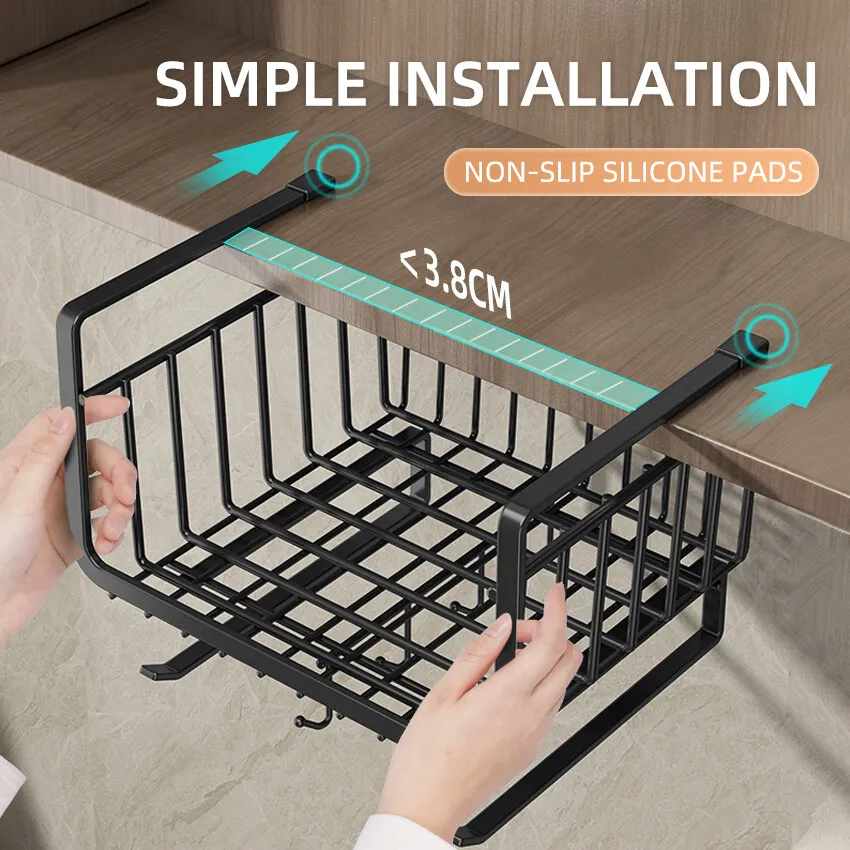Add instant storage with this Under-Cabinet Hanging Storage Basket. Designed to slide and pull out smoothly, it creates extra space under cabinets, shelves, desks, or in closets. The hollowed design allows airflow and easy visibility, making it ideal for storing tissues, cups, kitchen supplies, or everyday essentials. Easy to install and space-saving, this sliding basket organizer helps keep your home neat and organized without taking up valuable counter or floor space.
